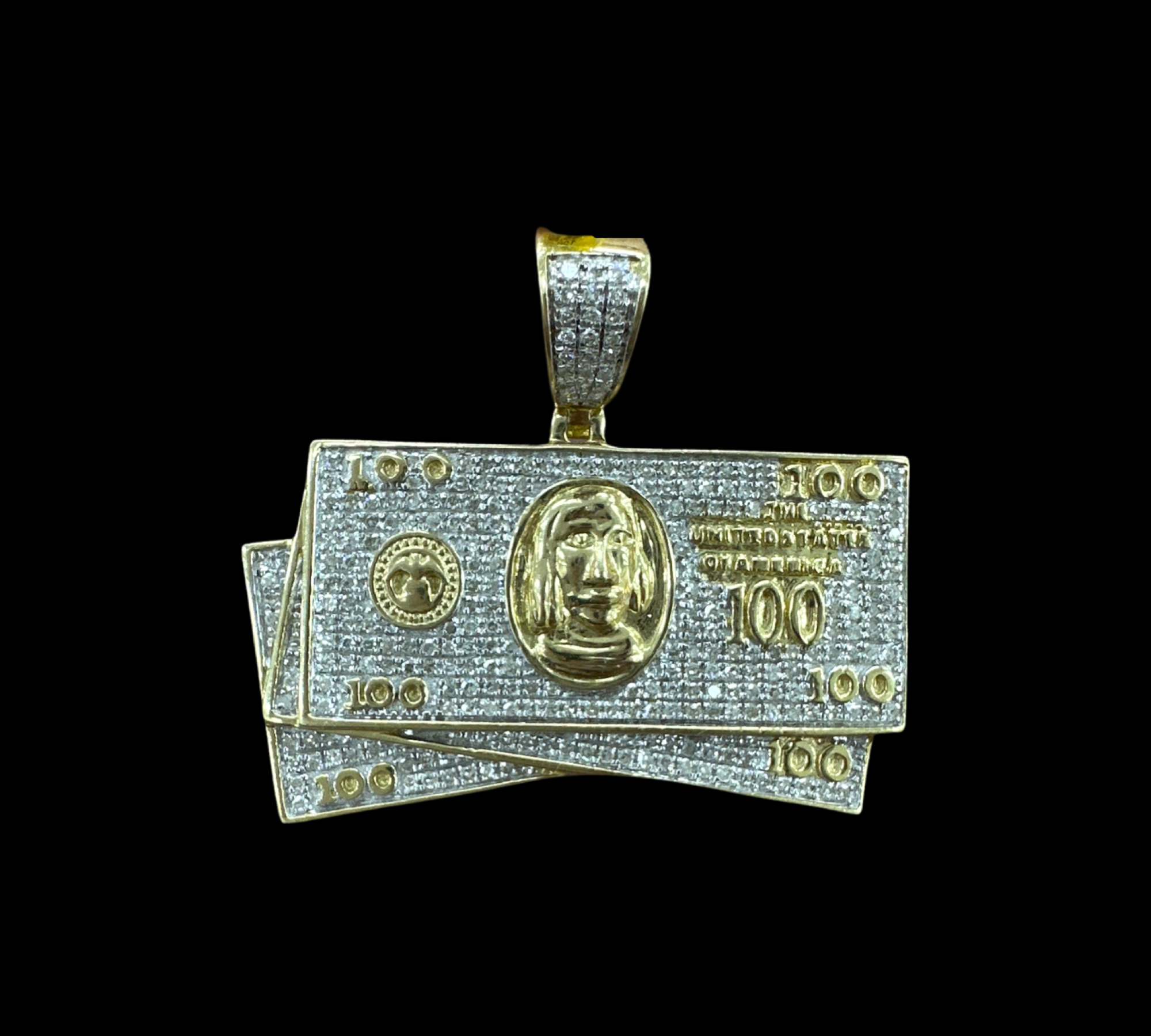 10KT Diamond Pendant, $100 BILL, Brand New (With Tags), (.80CT)