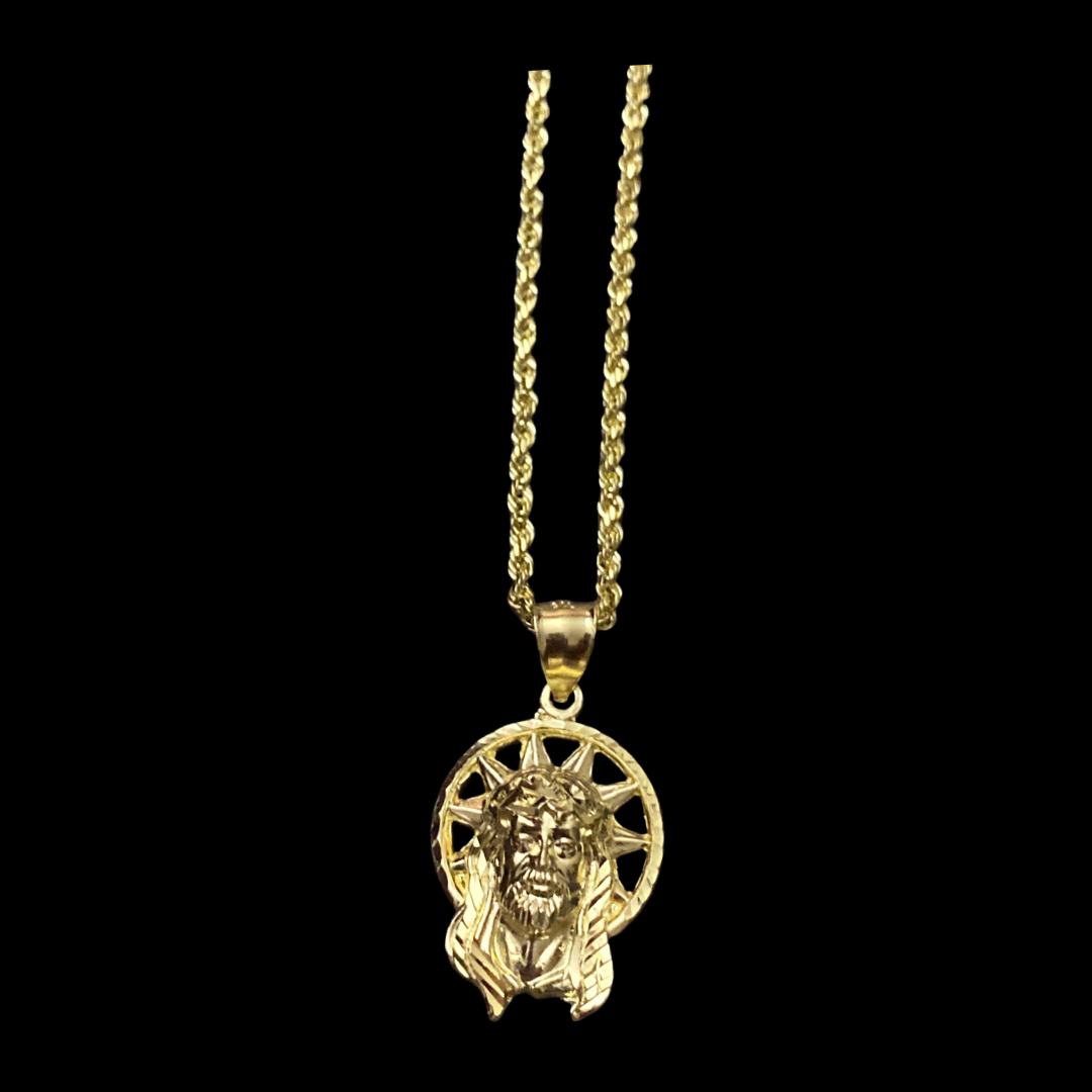 10KT Jesus Head With Halo Pendant With 10KT 2MM Hollow Diamond Cut Rope Chain 16"-24"