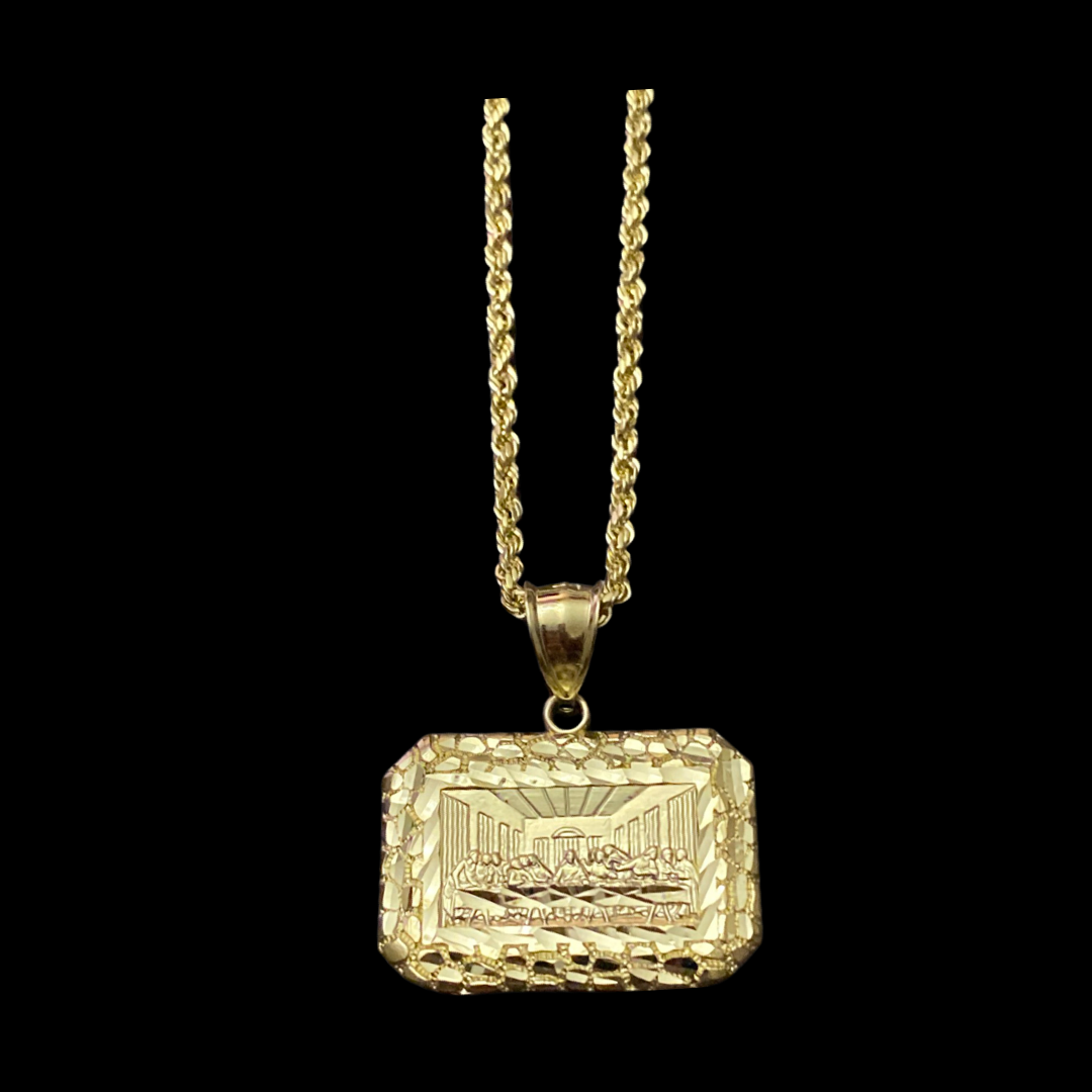10KT Nugget Last Supper Pendant With 10KT 2MM Hollow Diamond Cut Rope Chain 16"-24"