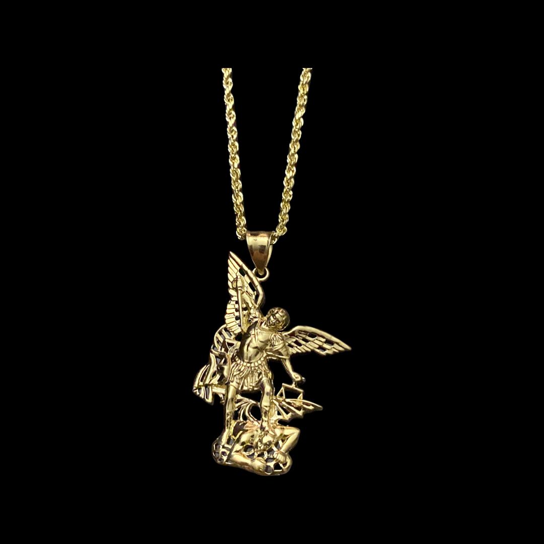 10KT Saint Michael Pendant With 10KT 2MM Hollow Diamond Cut Rope Chain 16"-24"