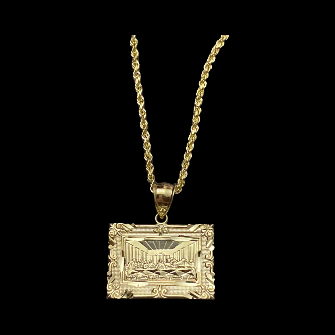 10KT Rectangle Last Supper Pendant With 10KT 2MM Hollow Diamond Cut Rope Chain 16"-24"