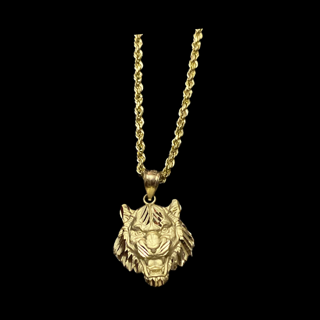 10KT Tiger Head Pendant With 10KT 2MM Hollow Diamond Cut Rope Chain 16"-24"