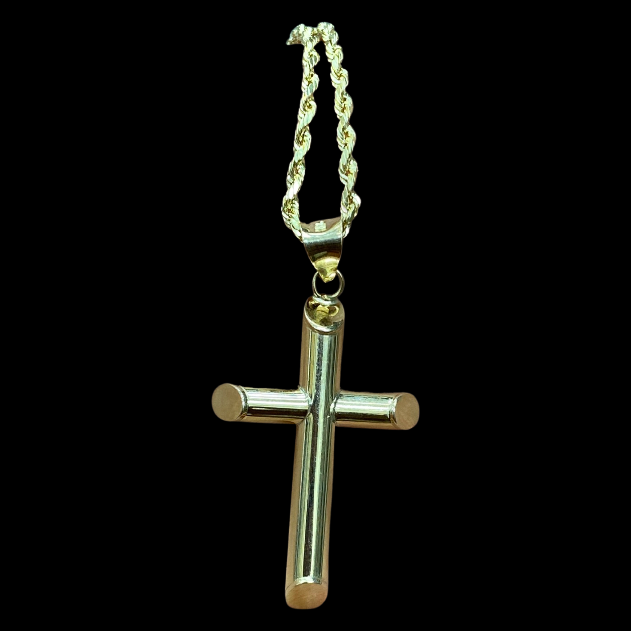 10KT Tube Cross Pendant With 10KT 2MM Hollow Diamond Cut Rope Chain 16"-24"