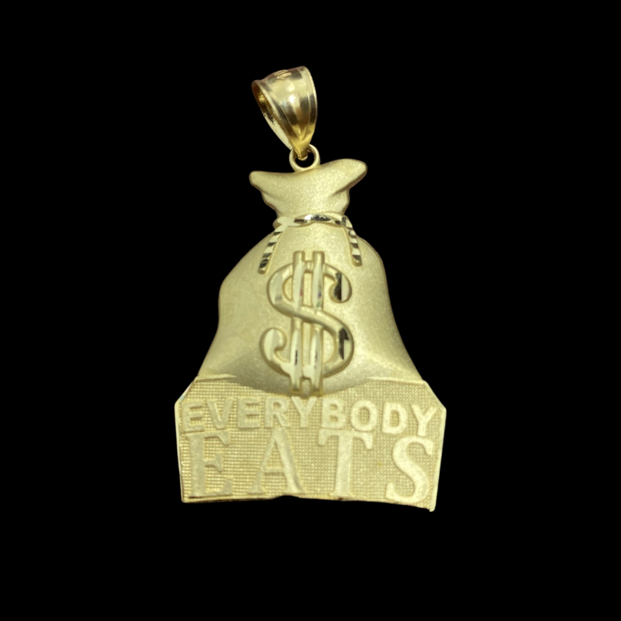 10KT Yellow Gold Diamond Cut Everybody Eats Pendant, Brand New