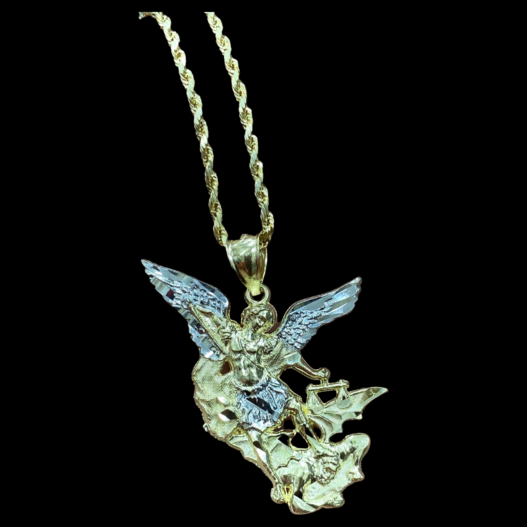 10KT 2-Tone Pave Saint Michael Pendant With 10KT 2MM Hollow Diamond Cut Rope Chain 16"-24"