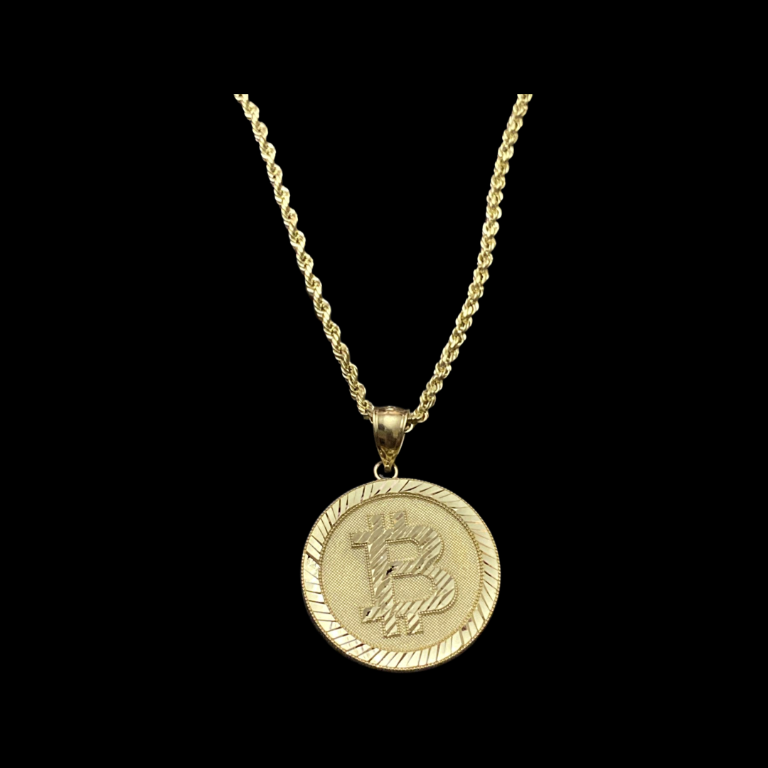 10KT Bitcoin Pendant With 10KT 2MM Hollow Diamond Cut Rope Chain 16"-24"