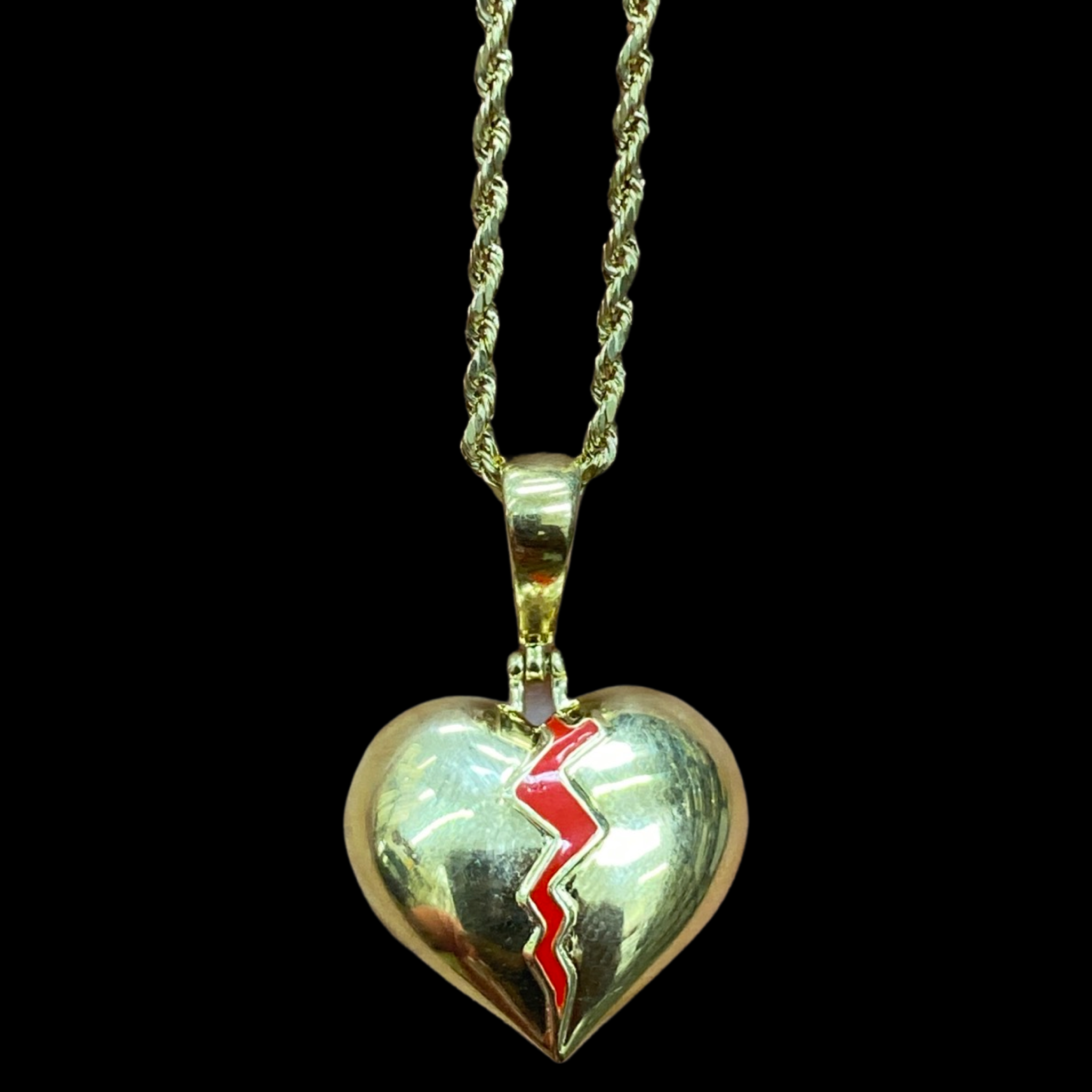 10KT Broken Heart With Red Enamel Pendant With 10KT 2MM Hollow Diamond Cut Rope Chain 16"-24"